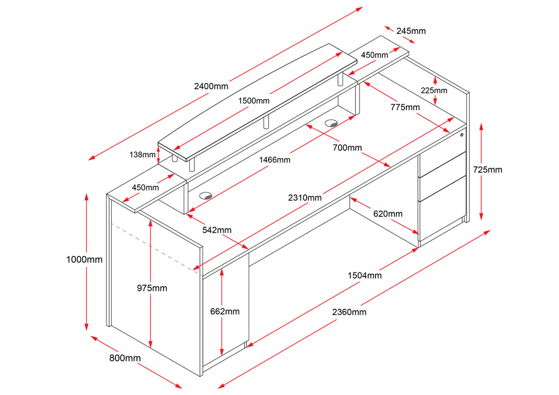 The inner side features a built in 3 drawer pedestal, CPU and storage cupboard, as well as chrome cable entry covers.